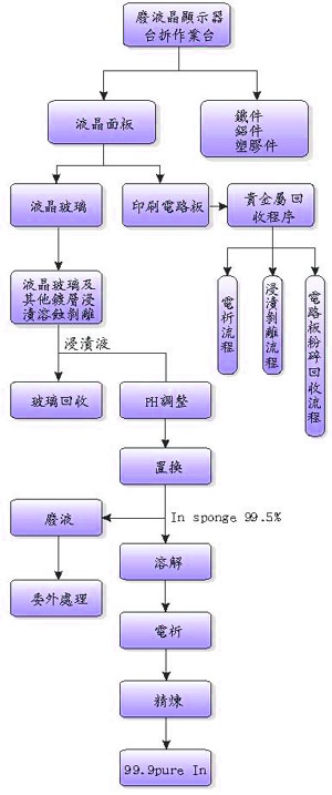 面板大致上可分為兩大部份,液晶玻璃及附屬零件,附屬零件部份則將拆卸下之單類物料分類貯存,電路板則進入貴金屬回收程序。液晶玻璃則利用浸漬槽將其各種鍍層剝離,浸漬完之玻璃回收處理,浸漬液則進入化學處理流程回收處理。